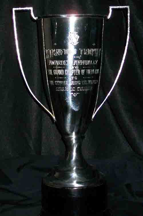 The Grand Chapter Scholarship Award, also referred to as the Stanford Trophy, is presented each year to the chapter with the most outstanding academic record for the previous calendar year. The award is represented by a trophy which was given to the Grand Chapter by Alpha Epsilon Chapter at Stanford University in 1928. The Grand Chapter Scholarship Award winner is determined by comparing the chapter GPA to the campus all-men’s average. Since some campuses measure grades outside of the traditional 4.0 scale, a formula is utilized to properly gauge academic performance for each chapter and to determine a winner.