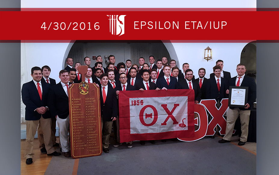 Several semesters of hard work and perseverance led to the reinstallation. On April 30, 2016, 41 men reinstalled the Epsilon Eta Chapter at IUP. International Chaplain Darick Brown presided over the ceremony, with Executive Director Mike Mayer and Field Executive Nick Hoke representing the International Headquarters. Members from Beta Nu/Case Western, Beta Chi/Allegheny, and Epsilon Psi/NJIT were present for the ceremony, with friends and family joining for the reception. “The chapter has been able to accomplish what we worked so hard for,” said Chapter President, Dillon Sutton (2018). “There’s a special kind of pride in being able to continue the legacy set by the alumni that came before us.” International Chaplain Darick Brown echoed Sutton’s sentiments, noting the responsibility each member now has to maintain the values and traditions of Theta Chi.