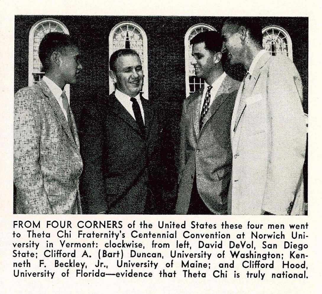 Among the most significant events is certainly DeVol’s appointment as Gamma Theta’s Delegate and traveling with three other brothers via car from San Diego to Norwich University in Vermont for Theta Chi’s 100th Anniversary Convention. During both legs of the cross-country road trip, DeVol stayed at and/or visited with brothers at Alpha/Norwich, Upsilon/NYU, Alpha Upsilon/Nebraska, Gamma Lambda/Denver, Gamma Tau/Drake, and Epsilon Lambda/Colorado Mines.