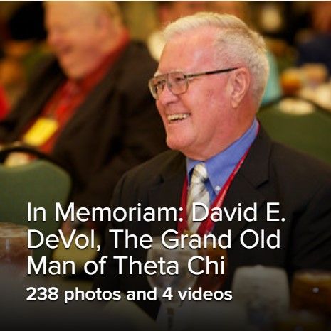 (David E. DeVol (Gamma Theta/San Diego State 1959), whose name has been almost synonymous with Theta Chi Fraternity, has joined the Chapter Eternal. Thus is ended a life which for nearly seven decades has been in substantial part devoted to the upbuilding of an organization to which he pledged allegiance in 1956 as a young student at San Diego State College. That loyalty expressed in unselfish service made him "The Grand Old Man of Theta Chi" long before 2013, when by formal resolution passed by the Grand Chapter that title was officially conferred upon him. (See formal resolution below.)