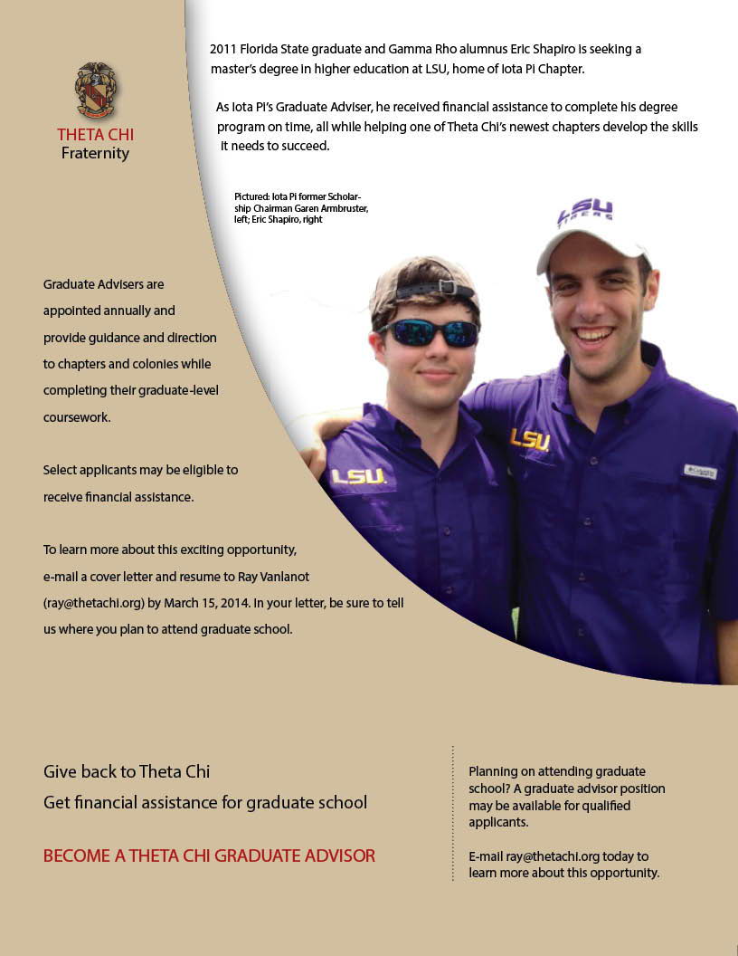 Theta Chi is looking for three more Graduate Advisors for it's chapters across the nation. If you are attending Graduate School for the 2014/2015 school year (at a different school than your undergraduate Alma Mater), and there is a Theta Chi Chapter located on your graduate campus, please contact Ray Vanlanot at ray@thetachi.org with your resume and cover letter as soon as possible. Also, please immediately apply for the Blue Scholarship (indicate your interest in the Graduate Advisor program).