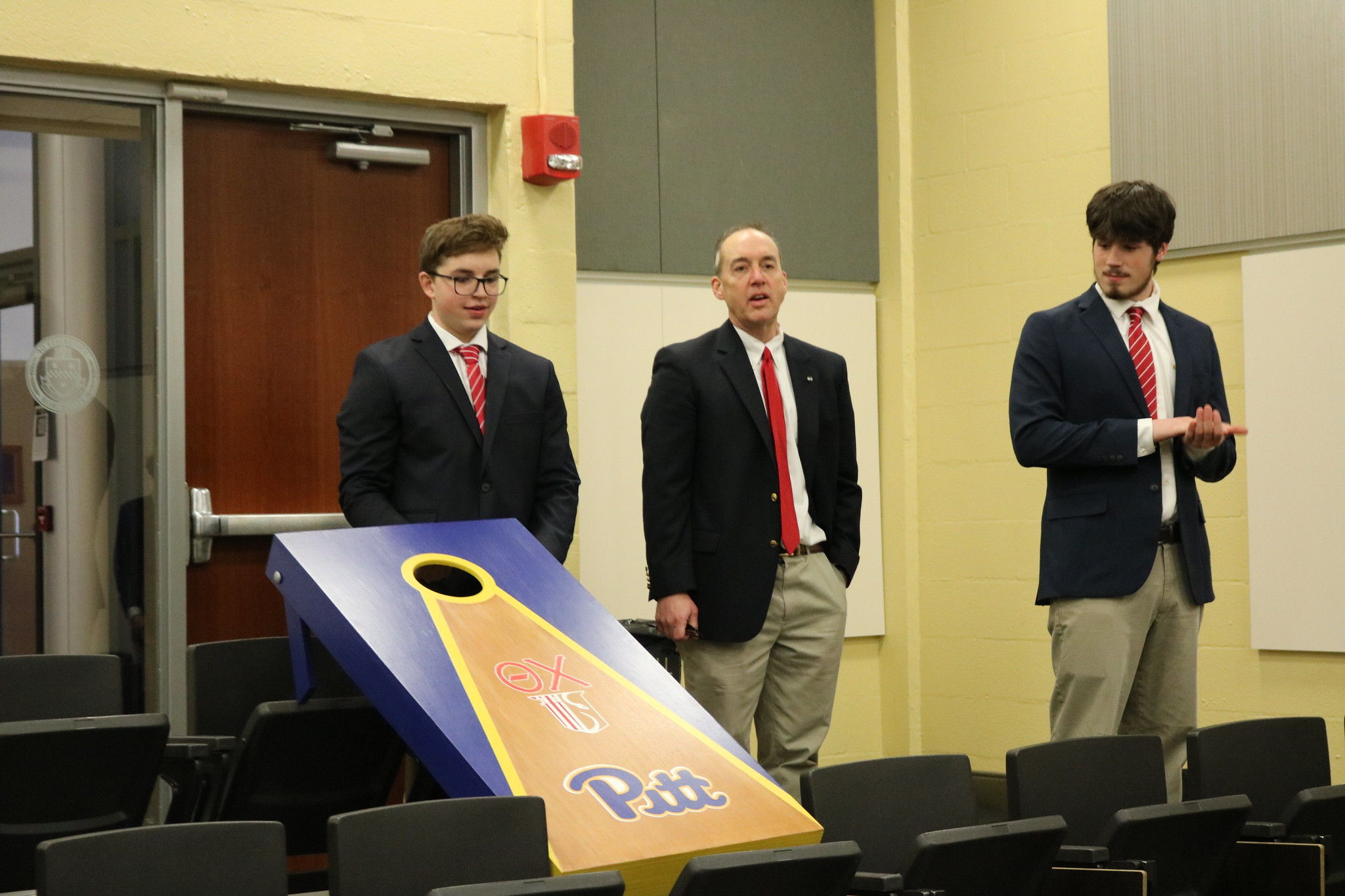 During the social gathering, Doug Payne presented the chapter with a custom Theta Chi/Pitt cornhole set as a reinstallation gift to Alpha Beta Chapter.