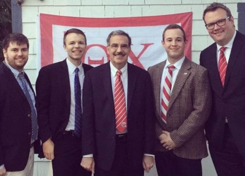 Guest of Honor: Theta Chi welcomes SUNY Cortland President, Dr. Eric Bitterbaum. (l-r): Director of Recruitment and Expansion Justin Jones, Field Executive Darien Key, Dr. Bitterbaum, Director of Education Brandon Younkin, and National Counselor Chad Strelow.