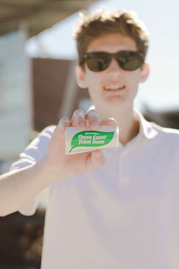 While visiting family at California Polytechnic State University, Nettels was drying his hands in a restroom when he paused to read a sticker on the towel dispenser that said, “Remember…These come from trees.” He said it made him stop and think about his personal impact on the environment by using paper towels.