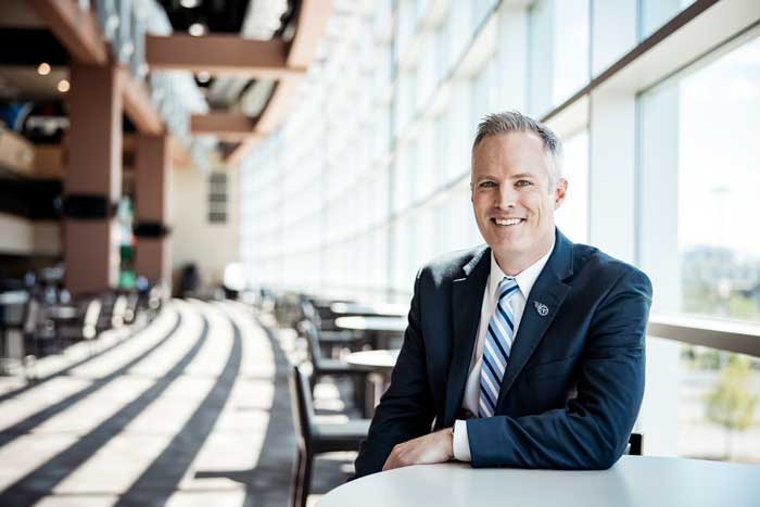 Burke Nihill ’00 sits for a photo inside Tennessee’s Nissan Stadium.