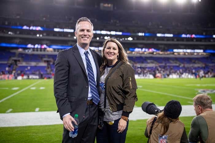 Burke ’00 and Holly (Munch) Nihill ’00 pose for a photo before the Tennessee Titans’ 2019 playoff game at Baltimore’s M&T Bank Stadium.